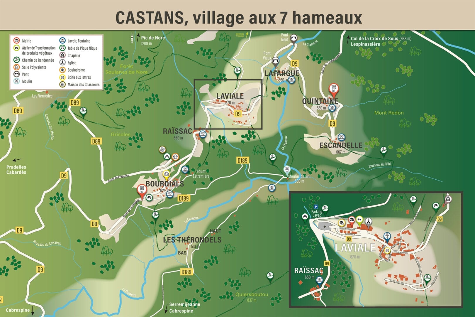 Laviale, située à 670 m d’altitude, est aujourd’hui le hameau principal avec la mairie, l’ancien presbytère récemment rénové, son église aux sept cloches, “Notre Dame de l’Assomption restaurée en 1860.